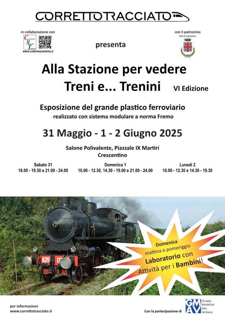 In occasione della festa del Santo Patrono di Crescentino l’associazione “Corretto Tracciato” organizza la manifestazione “Alla Stazione per vedere treni e … trenini” che si svolgerà presso il salone Polivalente di Crescentino. La manifestazione, organizzata con il patrocinio del comune di Crescentino e la collaborazione dell’associazione “CMT” vedra anche la presenza del Gruppo Modellistico Alto Verbano ed una riproduzione della stazione di Biella.